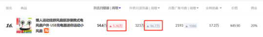 以熱銷商品榜NO.16的“掛脖風(fēng)扇”為例,上周抖音銷量5.2萬(wàn),瀏覽量達(dá)到96.7萬(wàn)。