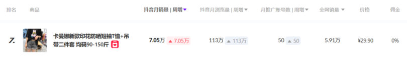 以熱銷商品榜NO.7的“防曬短袖T恤”為例,這是從5/4開(kāi)始推廣的夏季新品,兩天在抖音瀏覽量80萬(wàn),轉(zhuǎn)化了5.2萬(wàn)的銷量。