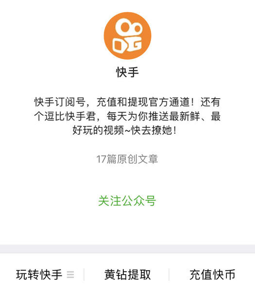 2、點(diǎn)擊公眾號(hào),搜索“快手”并關(guān)注“快手”公眾號(hào);
