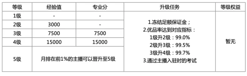 2.主播層級(jí):當(dāng)前分為5個(gè)等級(jí)和16個(gè)專(zhuān)業(yè)領(lǐng)域。1級(jí)主播只有經(jīng)驗(yàn)值,2級(jí)及以上主播才有專(zhuān)業(yè)分,3級(jí)及以上主播可以設(shè)置多個(gè)專(zhuān)業(yè),但請(qǐng)注意,多個(gè)專(zhuān)業(yè)情況下您的專(zhuān)業(yè)分將會(huì)被平均處理。只有滿(mǎn)足對(duì)應(yīng)等級(jí)要求后,主播才可以晉升到下一個(gè)等級(jí)。