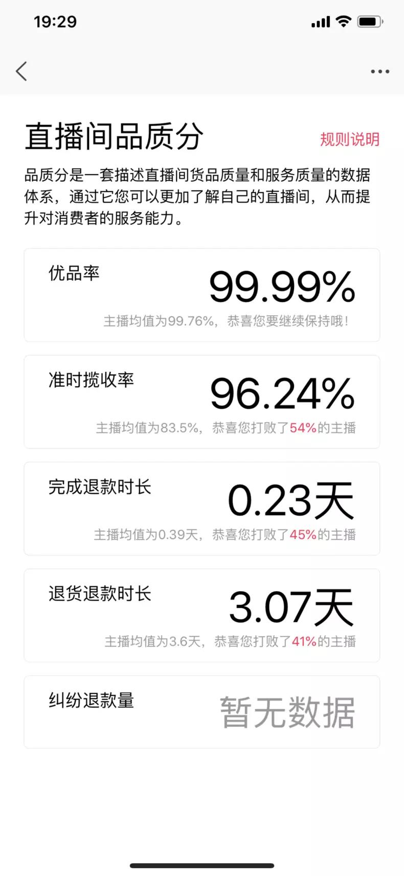 4.直播間品質(zhì)分:一套描述直播間貨品質(zhì)量和服務(wù)質(zhì)量的數(shù)據(jù)體系。品質(zhì)分細(xì)分為5個(gè)指標(biāo):優(yōu)品率、準(zhǔn)時(shí)攬收率、完成退款時(shí)長(zhǎng)、退貨退款時(shí)長(zhǎng)和糾紛退款量,數(shù)據(jù)統(tǒng)計(jì)口徑為直播間近30日的平均數(shù)據(jù),每天上午11點(diǎn)以后更新(偶爾會(huì)12點(diǎn))。