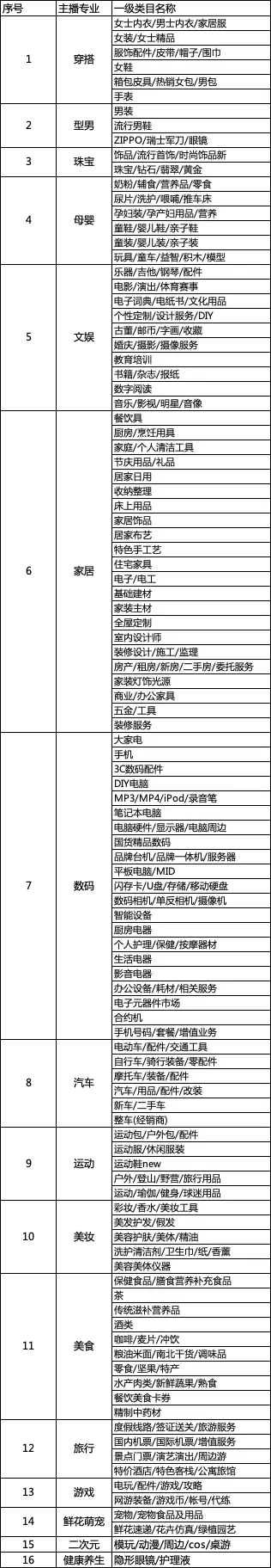 A:鑒于很多主播不清楚主營(yíng)類(lèi)目和專(zhuān)業(yè)的對(duì)應(yīng)關(guān)系,我們將專(zhuān)業(yè)和一級(jí)類(lèi)目對(duì)應(yīng)關(guān)系公示如下